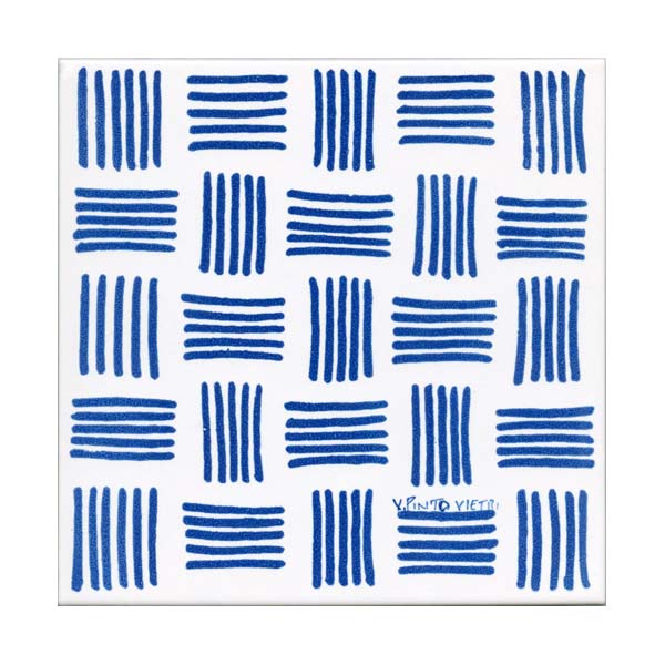 Piastrella in maiolica realizzata con supporto (biscotto) industriale, rivestita con smalto Bianco Vietri prodotto da Ceramica Pinto, e decorata al 100% a mano – con stampa (S).