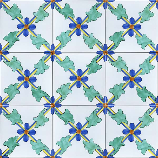 Piastrella in maiolica realizzata con supporto (biscotto) industriale, rivestita con smalto Bianco Vietri prodotto da Ceramica Pinto, e decorata al 100% a mano – con pennello (P) e stampa (S).