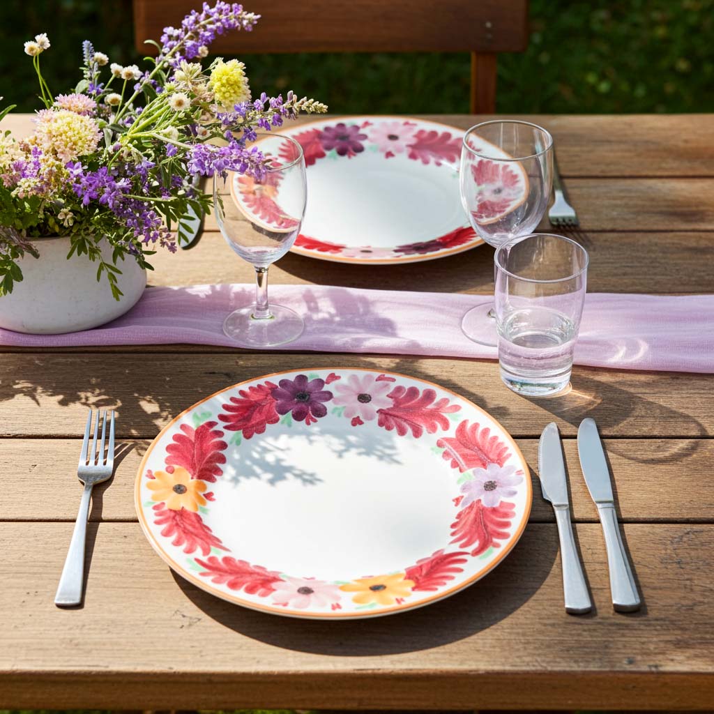 Piatto piano decorato a mano, con disegno tradizionale vietrese; da abbinare con gli altri decori tradizionali e con i piatti colorati di Vietri.